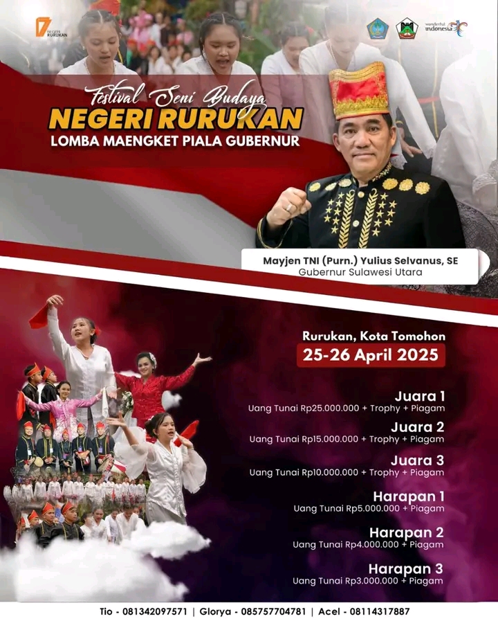 Tomohon – Ajang seni dan budaya bertajuk Festival Seni Budaya Negeri Rurukan akan kembali digelar pada 25-26 April 2025 di Rurukan, Kota Tomohon. Acara ini menghadirkan Lomba Maengket sebagai kompetisi utama, memperebutkan Piala Gubernur Sulawesi Utara, Mayjen TNI (Purn.) Yulius Selvanus Komaling., S.E.