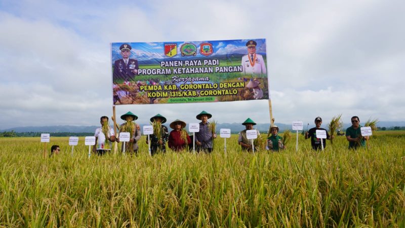 Limboto, -– Pemerintah Kabupaten Gorontalo bersama Kodim 1315/KG menunjukkan komitmen kuat dalam memperkuat ketahanan pangan daerah melalui pelaksanaan Panen Raya Padi Program Ketahanan Pangan, yang digelar di Desa Bongomeme, Kecamatan Dungaliyo, Kabupaten Gorontalo, Minggu, (4/1/2026).