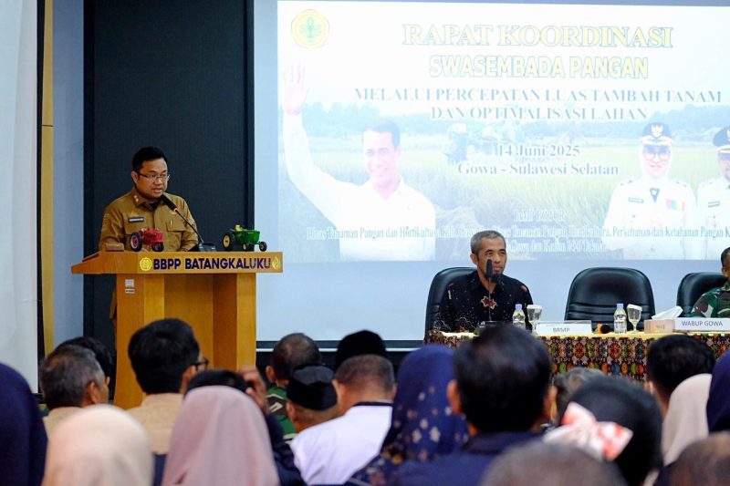 GOWA — Pemerintah Kabupaten (Pemkab) Gowa menunjukkan komitmen kuat dalam mendukung Program Swasembada Pangan yang menjadi bagian dari Visi Asta Cita Presiden Prabowo Subianto. Hal itu ditegaskan Wakil Bupati Gowa, Darmawangsyah Muin, dalam Rapat Koordinasi Swasembada Pangan melalui percepatan Luas Tambah Tanam (LTT) dan Optimalisasi Lahan (Oplah), di Aula Balai Besar Pelatihan Pertanian Batang Kaluku, Sungguminasa, Sabtu (14/6).