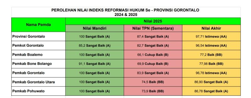 Capaian ini sekaligus menempatkan Kabupaten Gorontalo sebagai salah satu daerah dengan kinerja reformasi hukum terbaik di Provinsi Gorontalo pada tahun 2025.